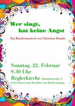 - Kindersingtage 2026Vom 16.-22. Februar finden unsere Kindersingtage unter dem Titel „Wer singt, hat keine Angst“ im Regler-Gemeindehaus Juri-Gagarin-Ring 103 statt.Wenn wir eine dunkle Straße entlang gehen, in der Ecke eine dicke Spinne sitzt… Kindersingtage 2026 weiterlesen